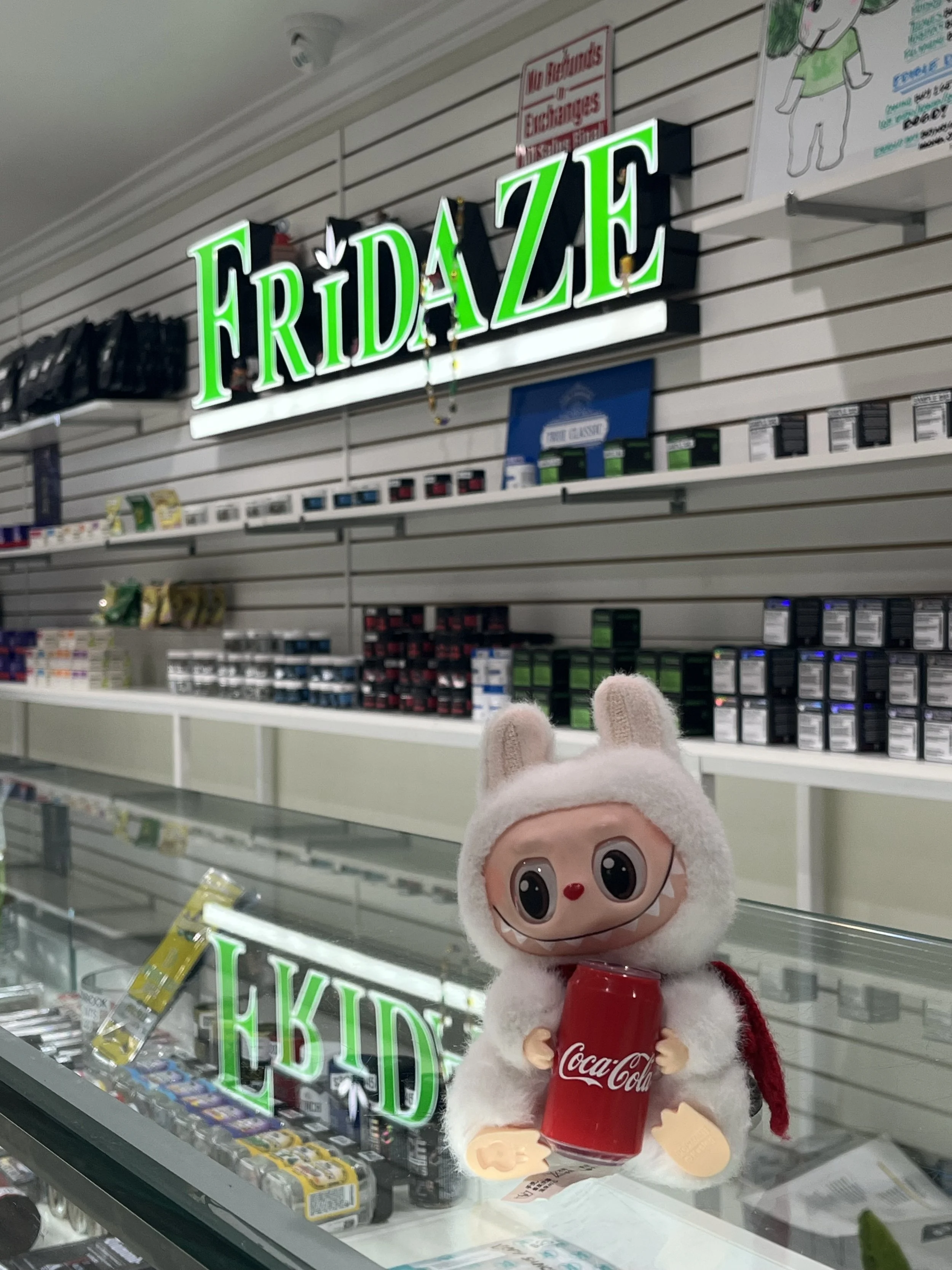 Fridaze does not accept any returns or product exchanges for any* product. All sales are final at the time of purchase and appropriate signage is placed in the store and by each register in clear view.